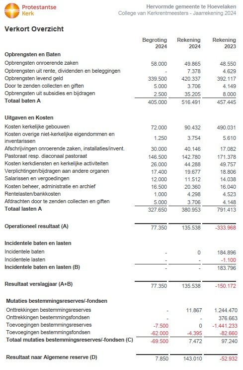 De kerkenraad heeft de algemene eindverantwoordelijkheid voor het in stand houden van een levende gemeente. Dat doet zij door zoveel mogelijk gemeenteleden in te schakelen bij het plaatselijk werk. Enkele taken zijn conform de kerkorde gedelegeerd naar afzonderlijke colleges, waaronder het College van Kerkrentmeesters en het College van Diakenen. Zij waken over de financiële slagkracht van de gemeente en leggen via een jaarverslag rekening en verantwoording af aan de kerkenraad. Een uittreksel van de belangrijkste gegevens treft u hieronder aan.