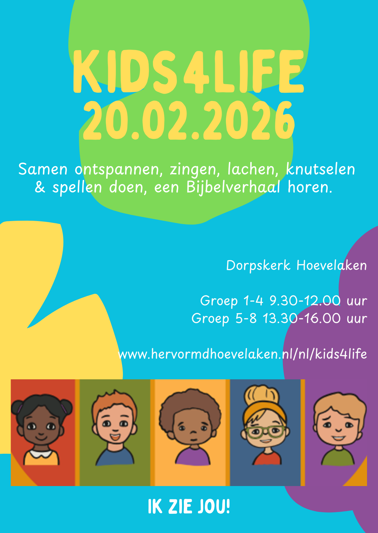 Op vrijdag in de herfst-, voorjaars- en meivakantie organiseren we een Kids4Life-dag; dit jaar rond het thema 'Ik zie jou!'. Op 20 februari 2026 zijn de kinderen voor de tweede keer dit seizoen van harte welkom bij de Dorpskerk. Kinderen van groep 1-4 zijn 's ochtends welkom vanaf 9.30 uur tot 12.00 uur. Voor groep 5-8 hebben we 's middags een programma van 13.30 tot 16.00 uur. We hopen natuurlijk veel nieuwe én bekende gezichten te zien!